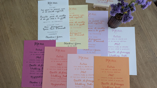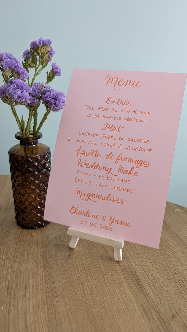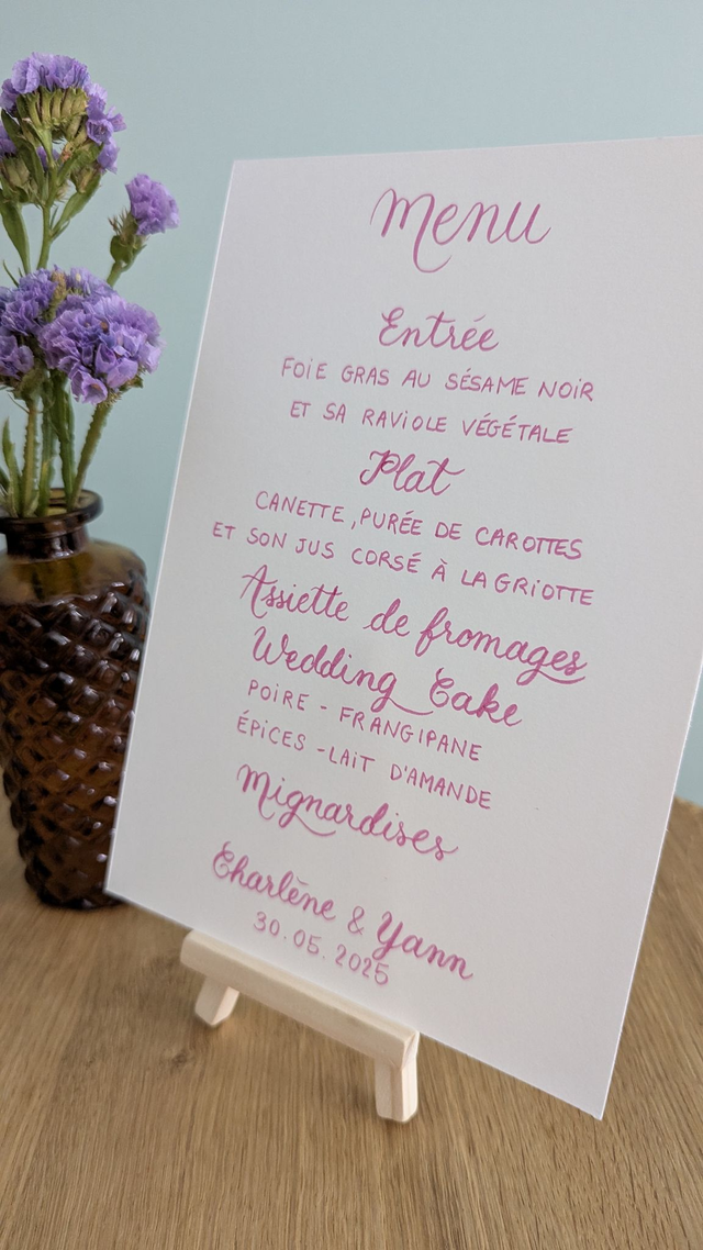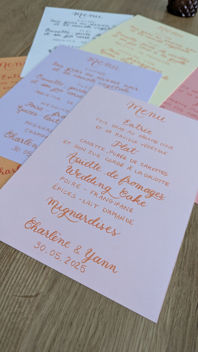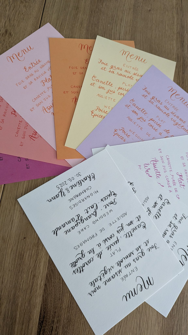 Menus de mariage calligraphiés à la main. Chaque menu est soigneusement réalisé pour un rendu authentique et raffiné.