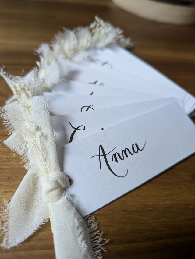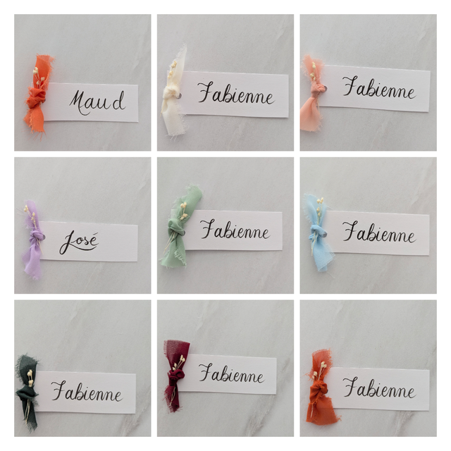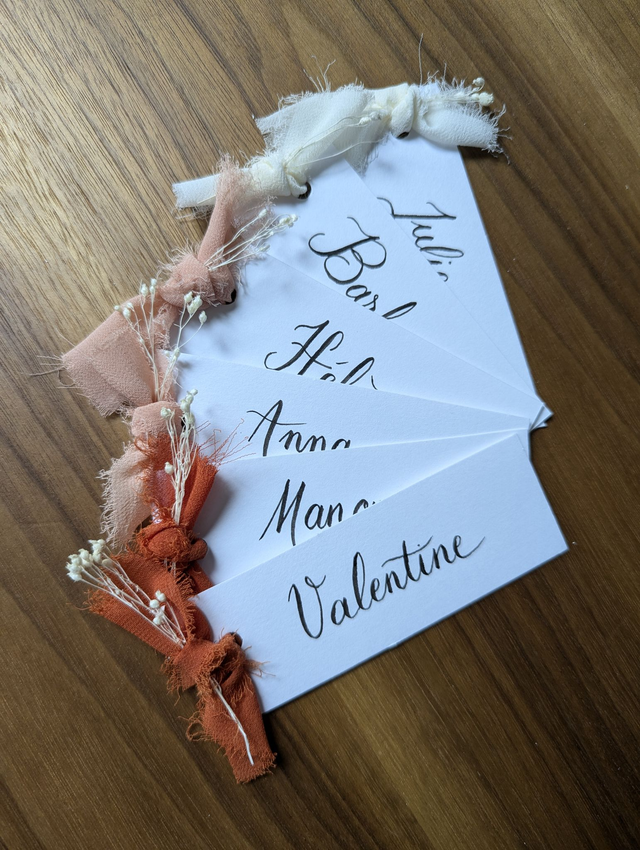 Marque-places calligraphiés à la main pour vos invités. Uniques et délicats, ils ajouteront de la couleur et un côté bohème à votre décoration de table et les invités les conserveront en souvenir de ce bel événement.